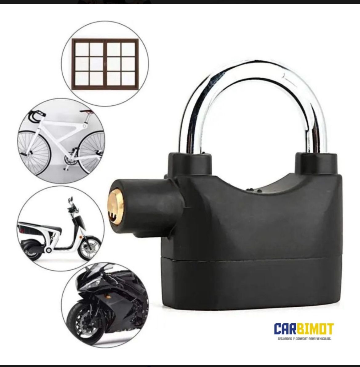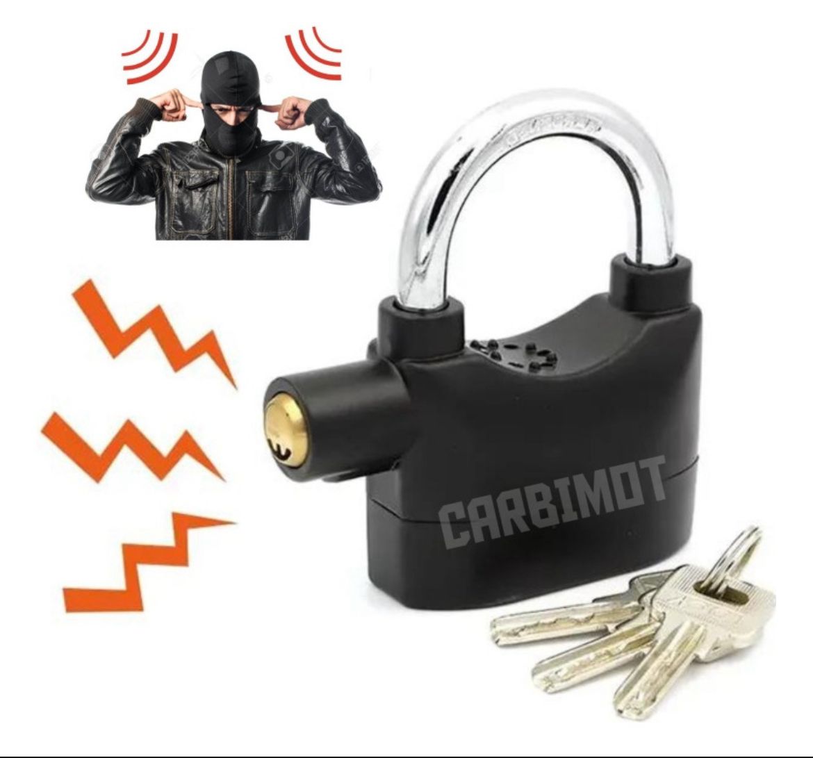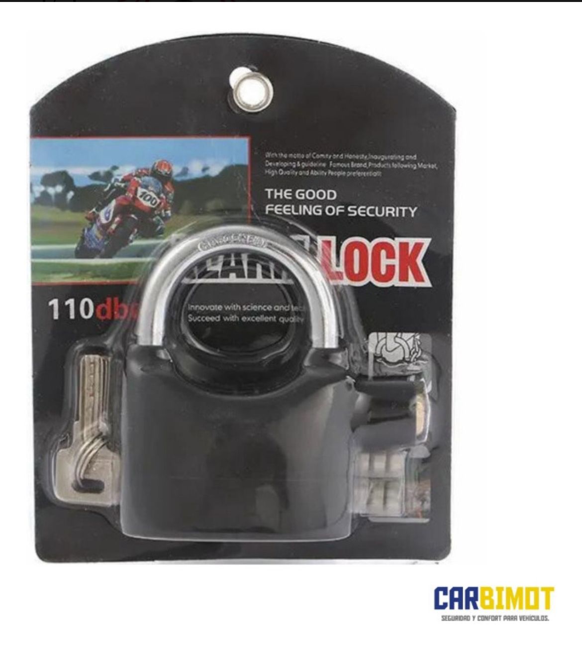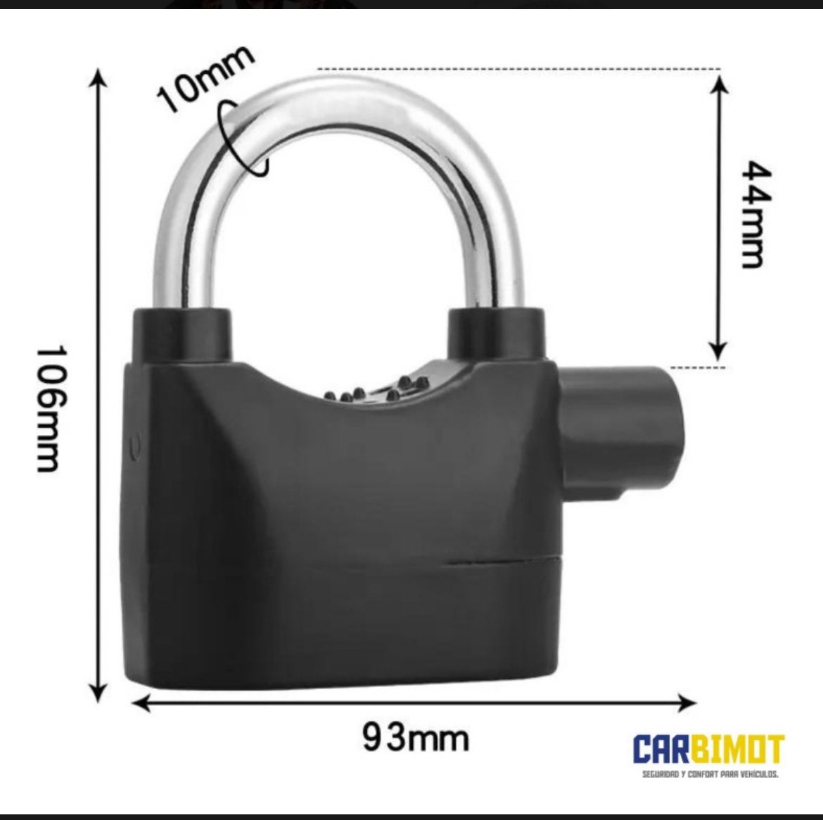 Este es un candado Carinock con alarma integrada de 110 dB, ideal para asegurar diversos objetos como puertas, ventanas, bicicletas, motos y contenedores. Cuenta con un perno que, al ser invertido, activa la alarma. Adicionalmente, posee un sistema de bloqueo que se activa al ser golpeado o sacudido.