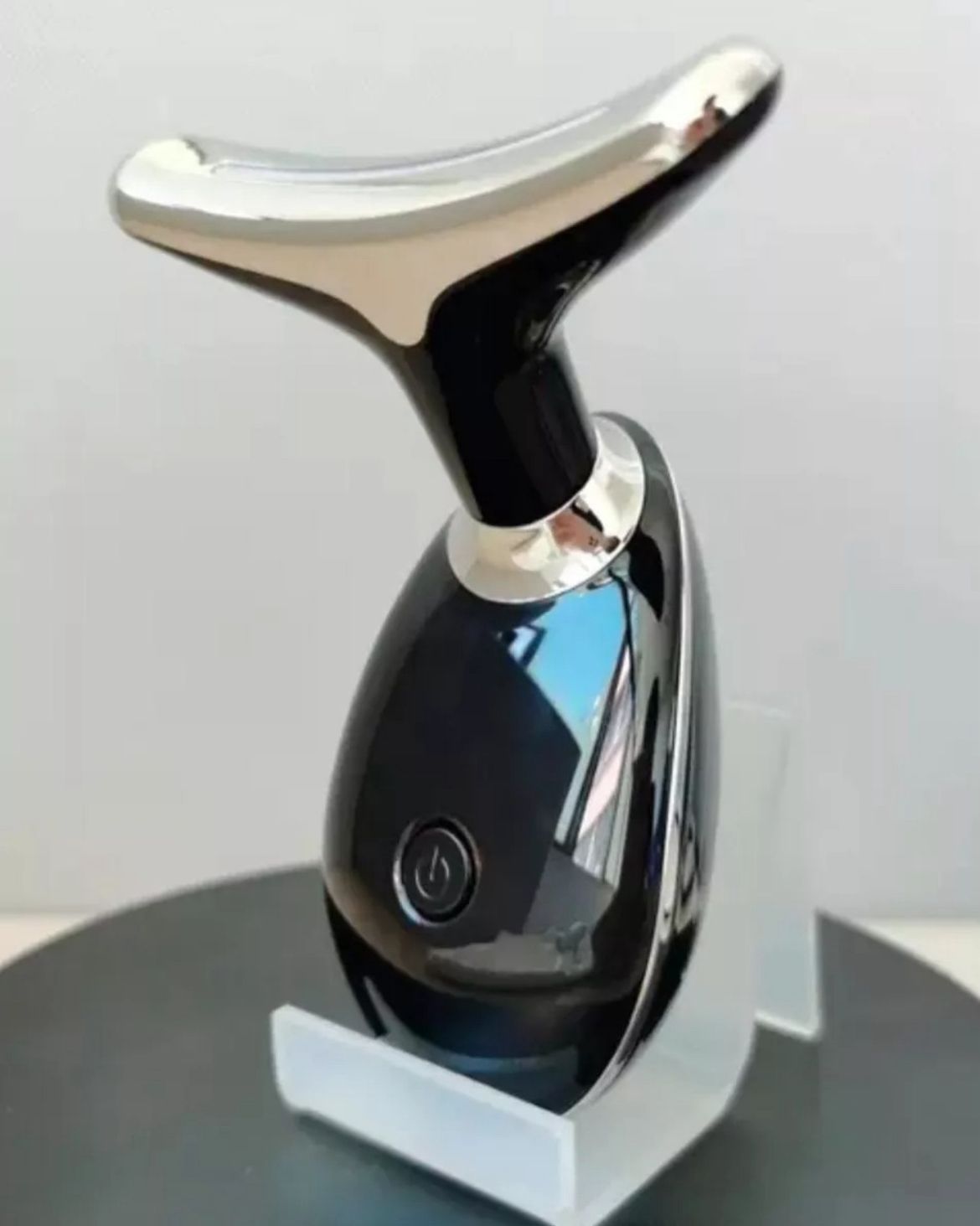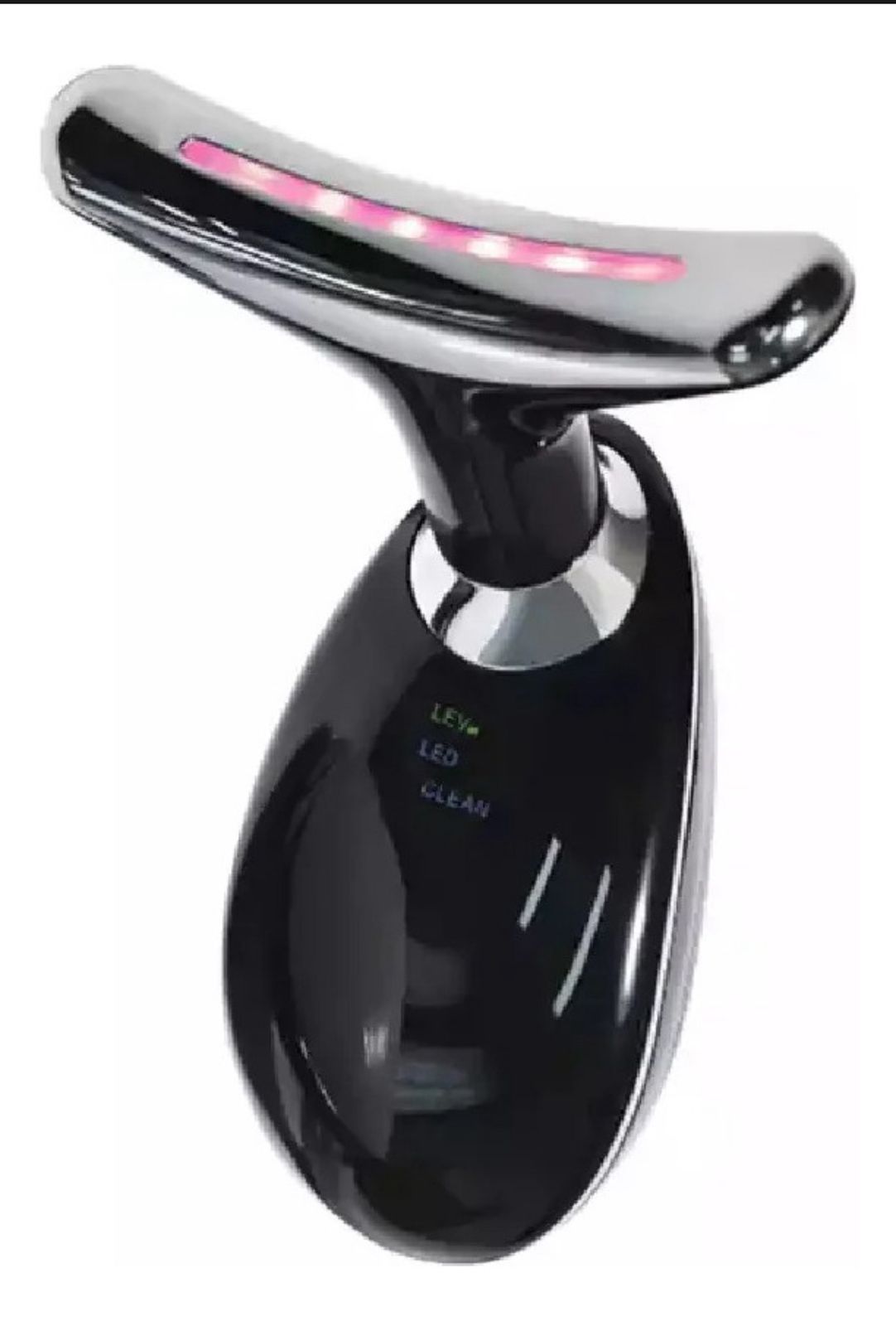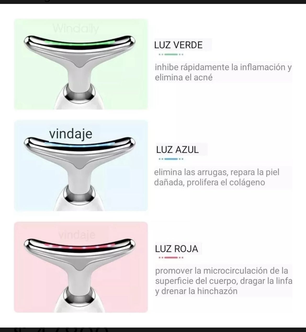 El dispositivo de la imagen es un masajeador facial y de cuello, diseñado para combatir los signos del envejecimiento y mejorar la apariencia de la piel. Este tipo de dispositivos suelen combinar varias tecnologías para lograr sus efectos: