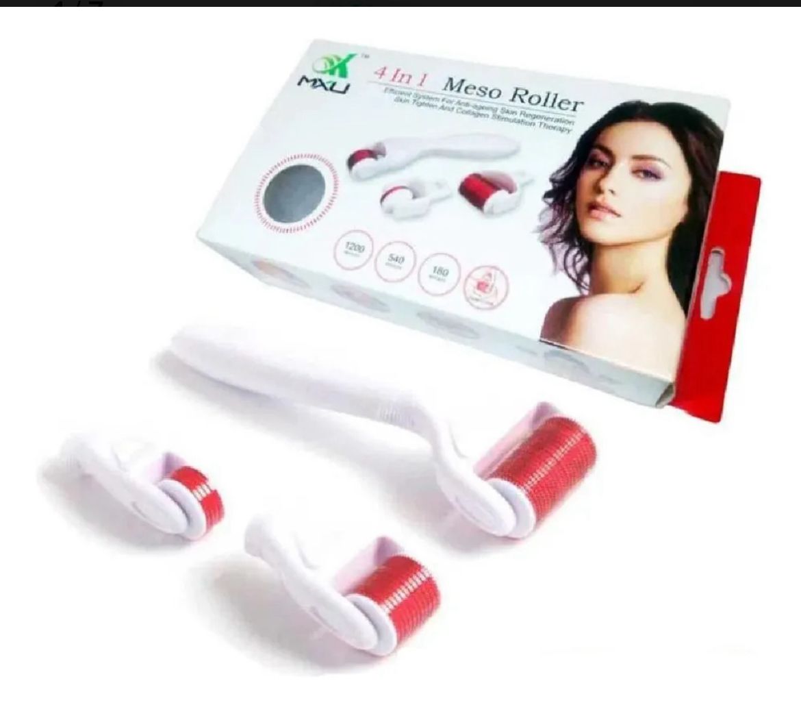 La imagen muestra un "4 en 1 Meso Roller" de la marca MXU, un sistema de rodillos diseñado para la regeneración de la piel, el estiramiento cutáneo y la estimulación del colágeno.