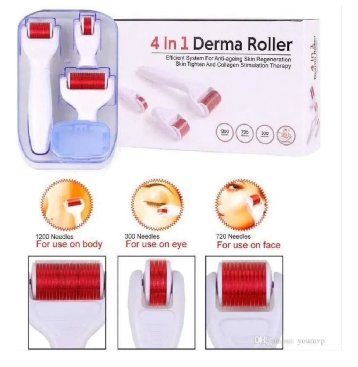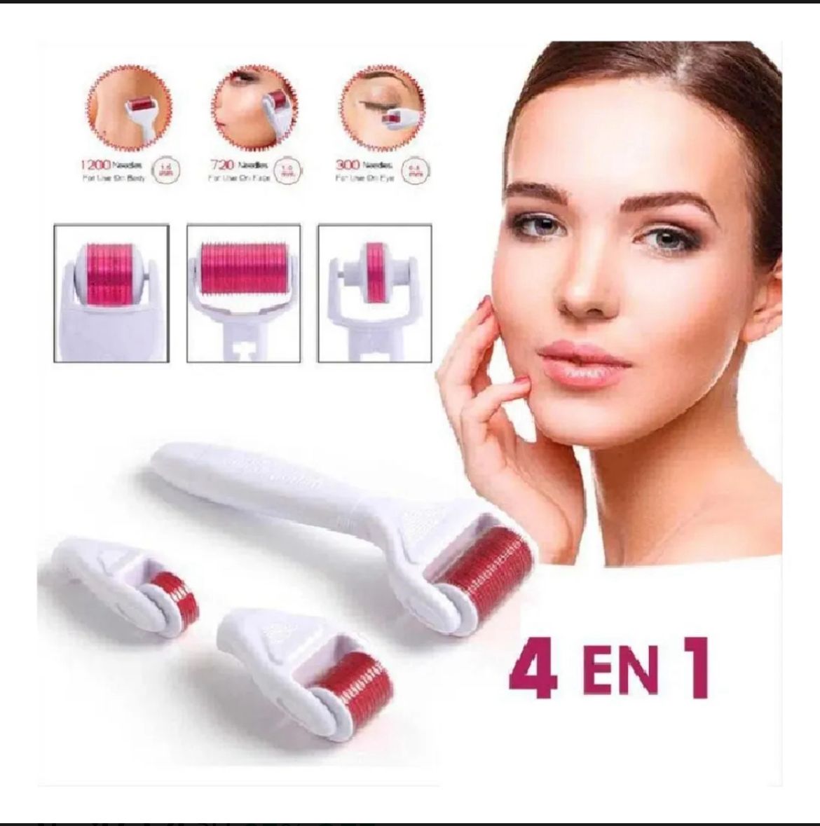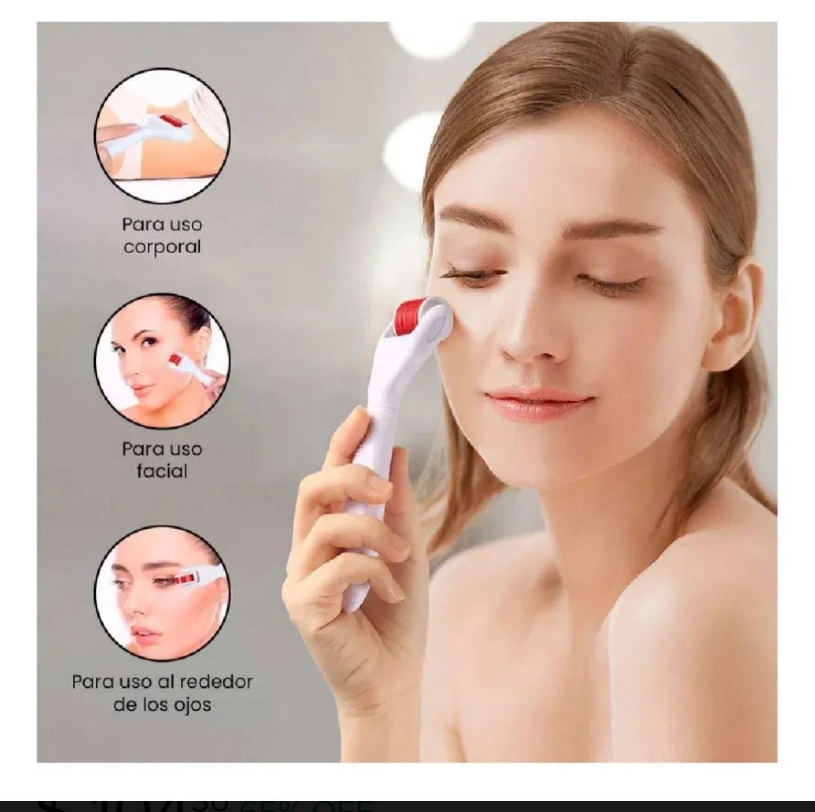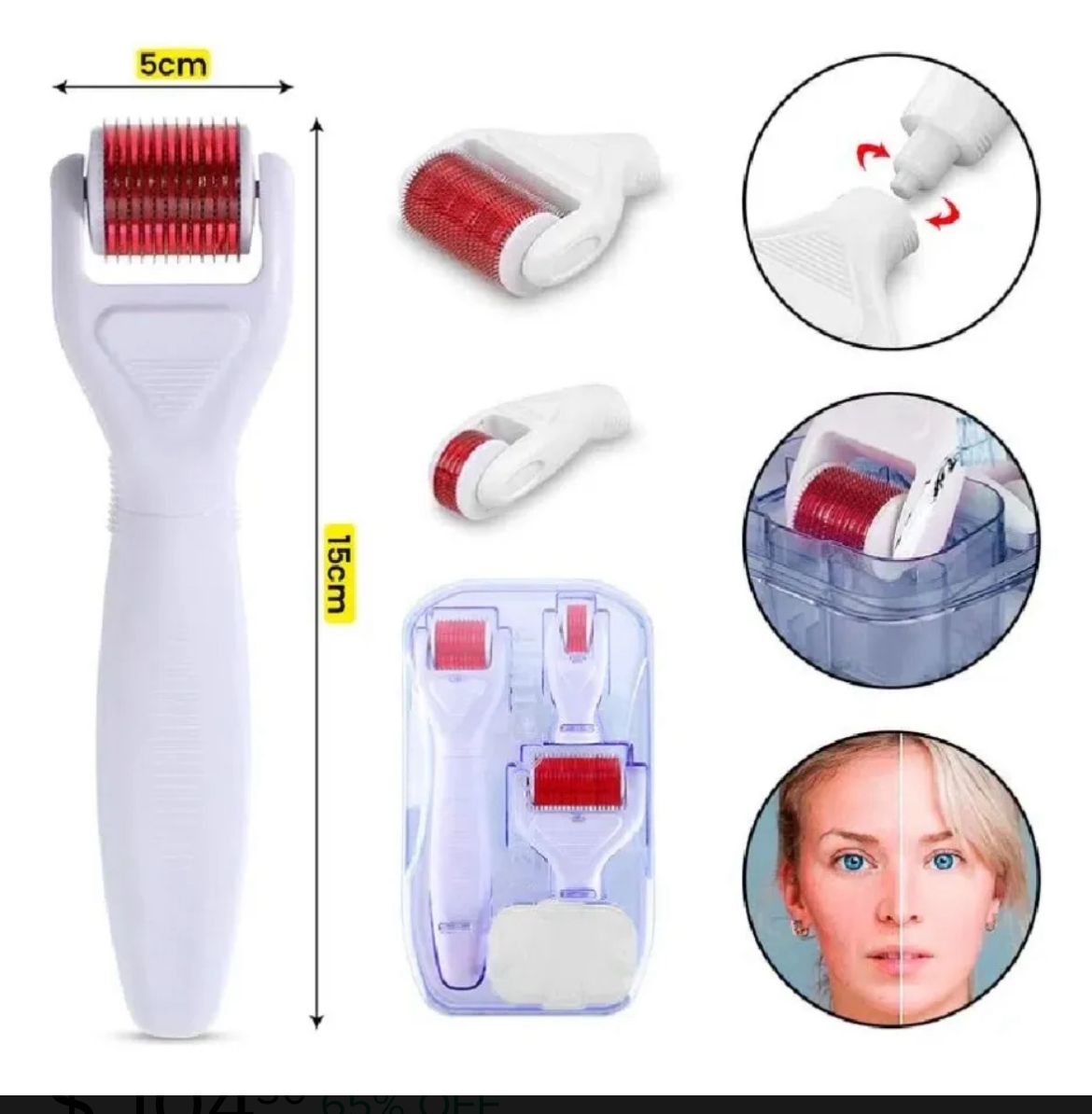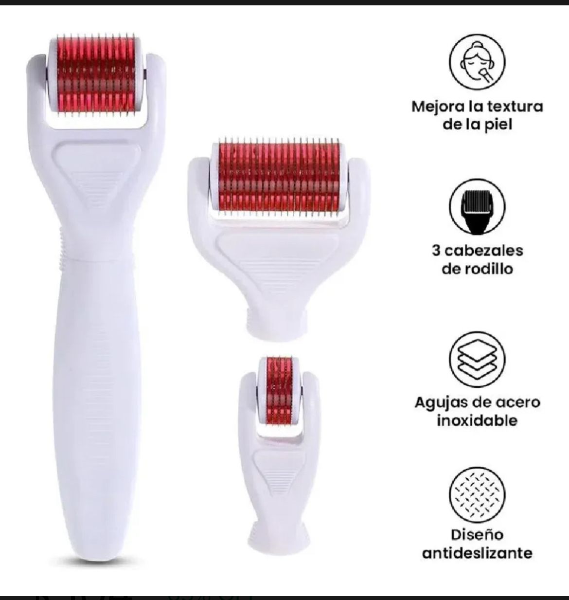 Incluye un mango y tres cabezales de rodillo intercambiables con diferentes cantidades de agujas (180, 540 y 1200) para diversas áreas de aplicación (ojos, rostro, cuerpo).