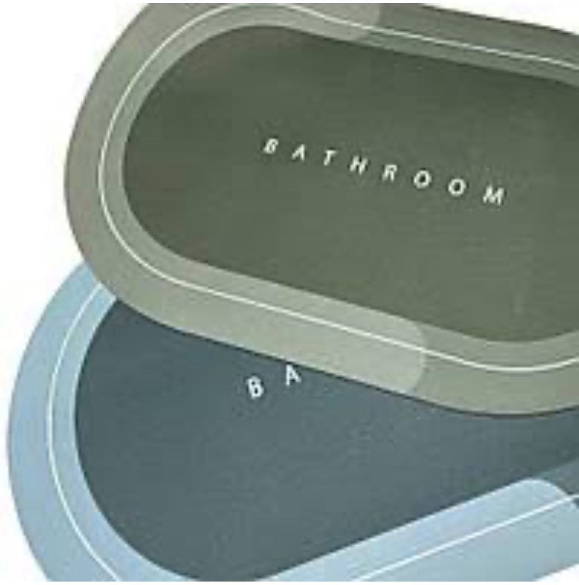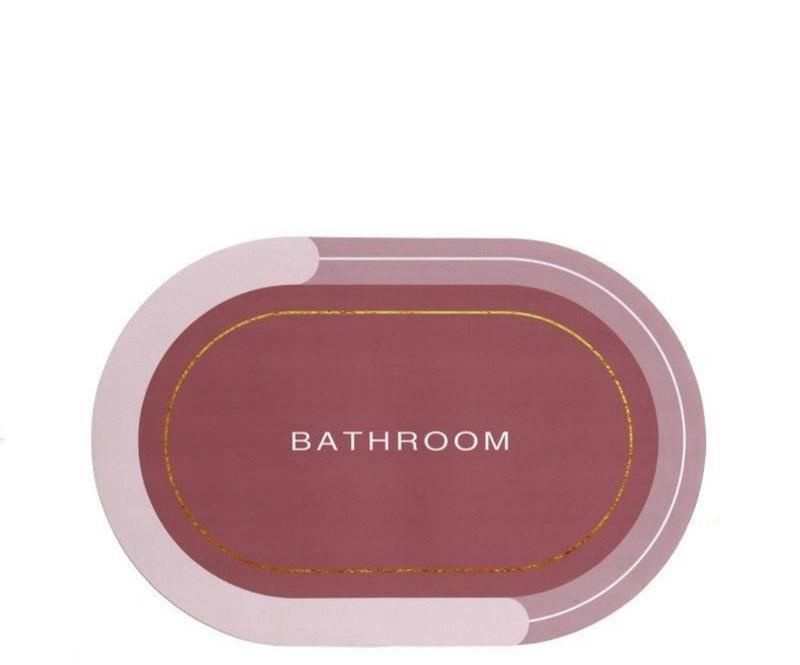 Identificación del producto: Es un tapete de baño con la palabra "BATHROOM" (BAÑO) escrita en él.